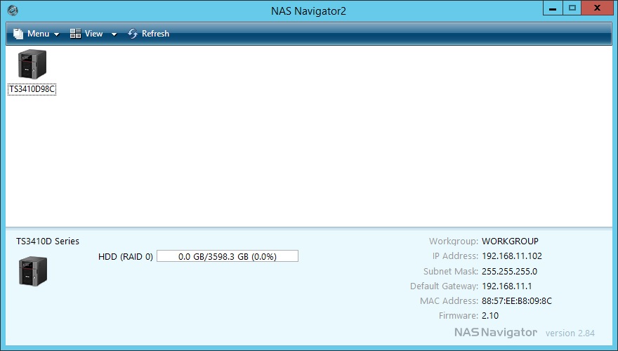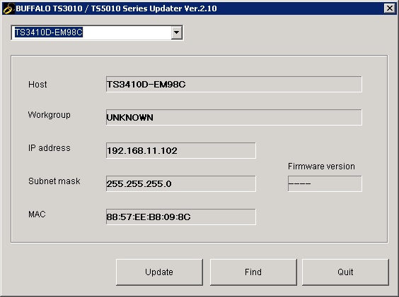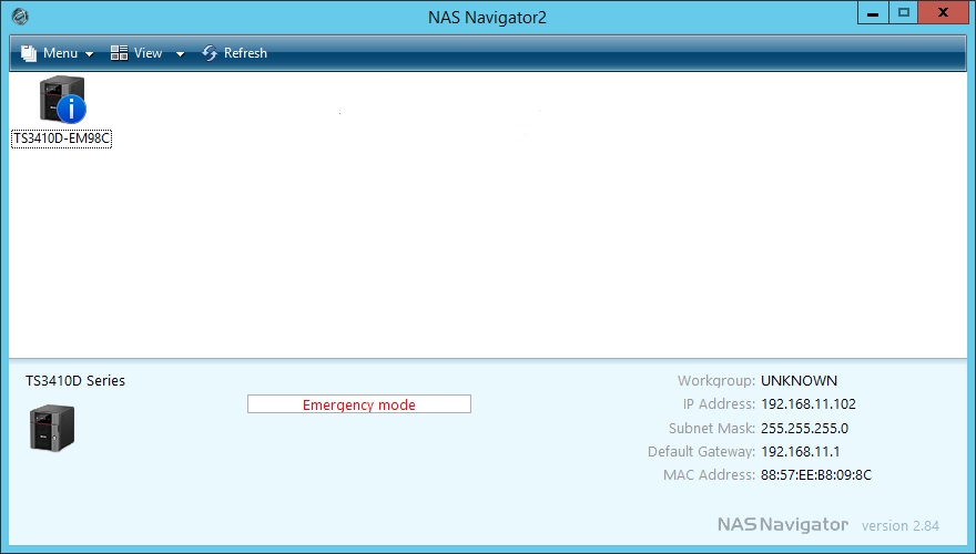 Any boot problems will result in the TeraStation coming up in “Emergency Mode”. The TeraStation will be listed in NAS Navigator with a name matching the model number followed by “EM” and the last three characters of the LAN 1 MAC address. Here is an example:
