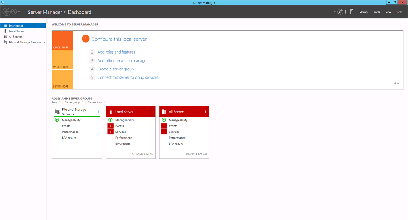1. Open the Windows Server Manager, and click Add roles and features. 2. In the Add Roles and Features Wizard, click Next until the “Features” selection appears.