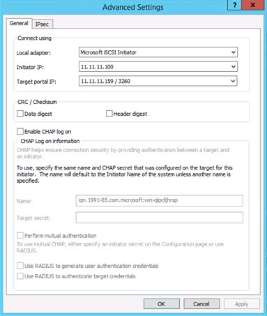 10. In Advanced Settings, select the corresponding Initiator/Target portal IP. Click OK when finished.