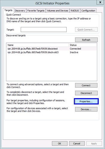 12. Now the Multipath connection has been established successfully. To confirm, click “Properties….” at the Targets tab