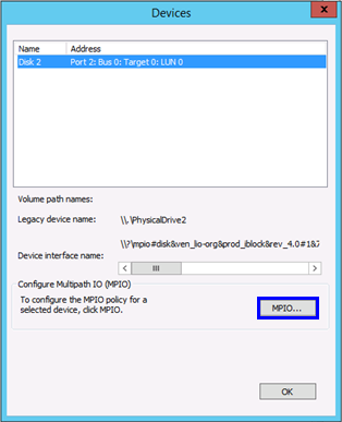 14. Then click “MPIO”. This button will grey out if Multipath connection has not been setup properly.