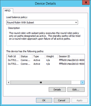 15. Here will show the 2 connected paths. You will also be able to change the load balance policy from the drop down. 16. Also check the Properties of the connected iSCSI disk from Windows Disk Manager. If you have two exact same iSCSI disks showing here, please check your MPIO configuration again.