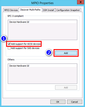 5. MPIO support for iSCSI devices can be added via the MPIO tool from Administrative Tools. 6. In MPIO Properties, switch to Discover Multi-Paths tab. Check the option of “Add support for iSCSI device”. Then click “Add”.