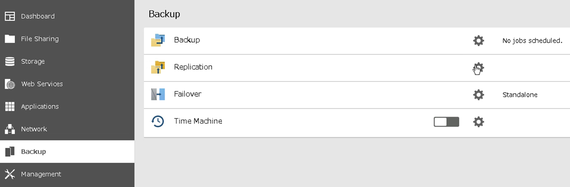 Next we’ll set up the replication source on the TeraStation. Open the web interface for the TeraStation. 9. Open the user interface for the source device and go to the “Backup” tab. Click on the configuration icon to the right of “Replication”.