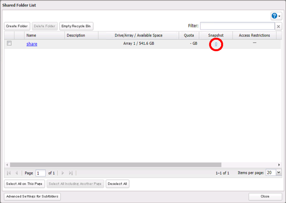Note: Up to 1,024 snapshots can be created for either a shared folder or an iSCSI volume. We recommend keeping no more than 65,536 snapshots total on a TeraStation. If you have created more than 65,536 snapshots, it may result in unexpected system behavior and slowdown.