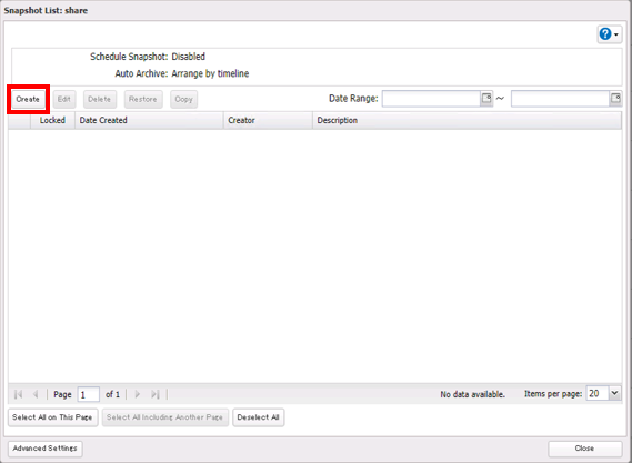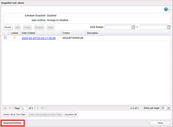 If you want to create a snapshot for the purpose of regular backups, follow the procedure below. 1. At the Snapshot list window of the Share you want to schedule snapshot, click Advanced Settings at the lower-left corner of the window.