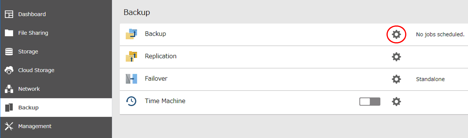Configure a Share Folder Snapshot Backup Job 1. From the Backup tab, Click the settings icon to the right of “Backup”.