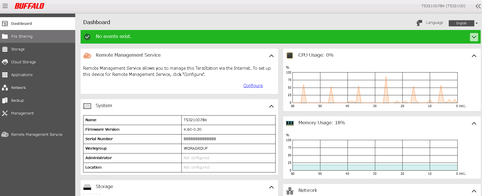 13. The TeraStation UI dashboard will show up. At this point the basic configuration is complete and the TeraStation is ready for use.