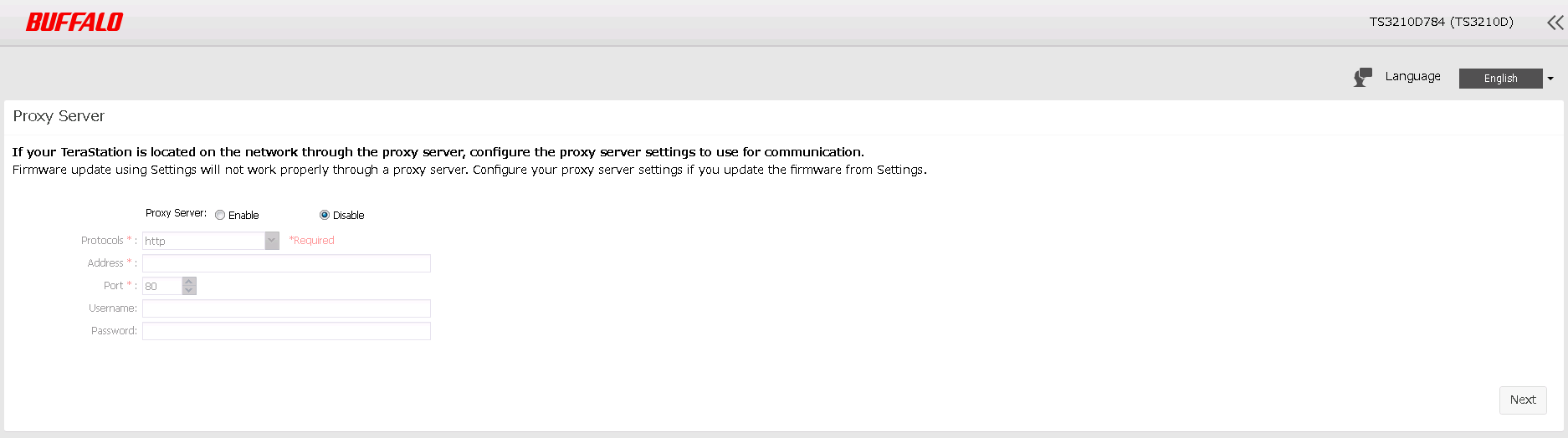 6. Configure the proxy server if your TeraStation is located on the network through the proxy server. 7. (Only on TS5020/3030 series firmware v3.00 or later) Setting up automatic firmware updates options. Automatic update "immediately" will be the default selection.