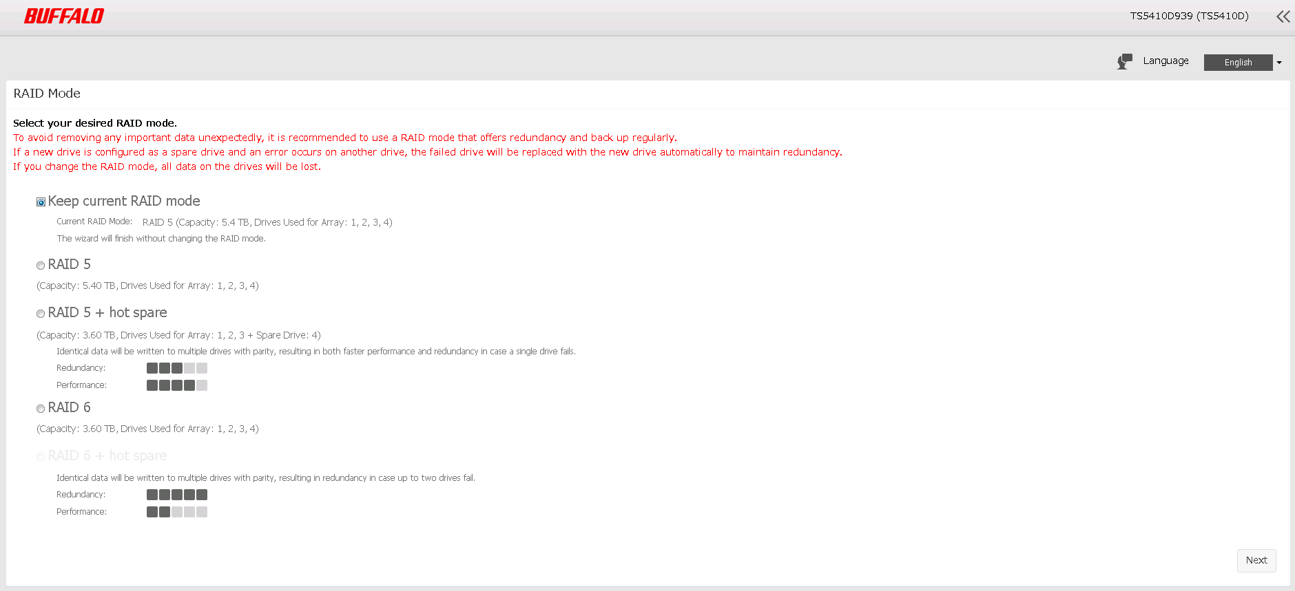 9. Select the desired RAID mode. Select “Keep current RAID mode” to use the default array type that’s already configured out of the box. The default RAID mode will depend on different TeraStation bay models. 10. (Only on TS5020/3030 series firmware v3.00 or later) Drive Encryption Settings. Encrypt is the default selection. Note: Drives can be encrypted with 256-bit AES. Encrypted drives and arrays are then readable only from that specific TeraStation. Drive Encryption will erase any existing data on the Drive. Drives' read and write speeds may decrease after drive encryption. 11. (Only on TS5020/3030 series) Configure LVM settings. Please refer to the User Manual for the usage and limitation of LVM.
