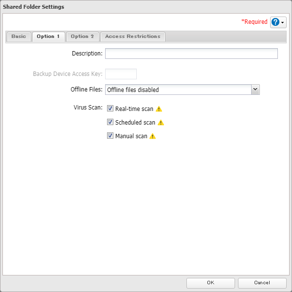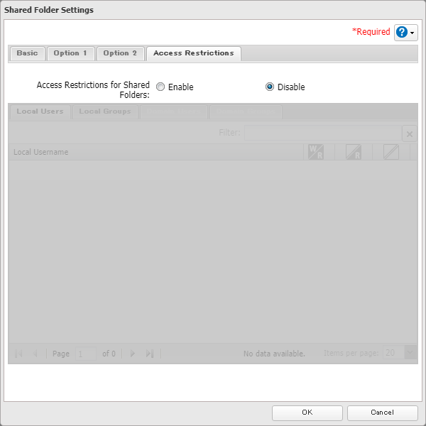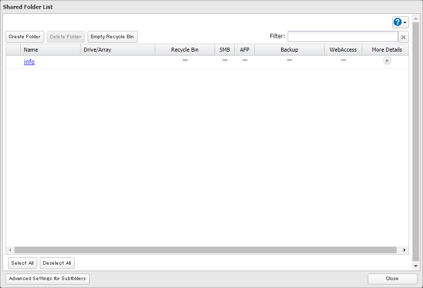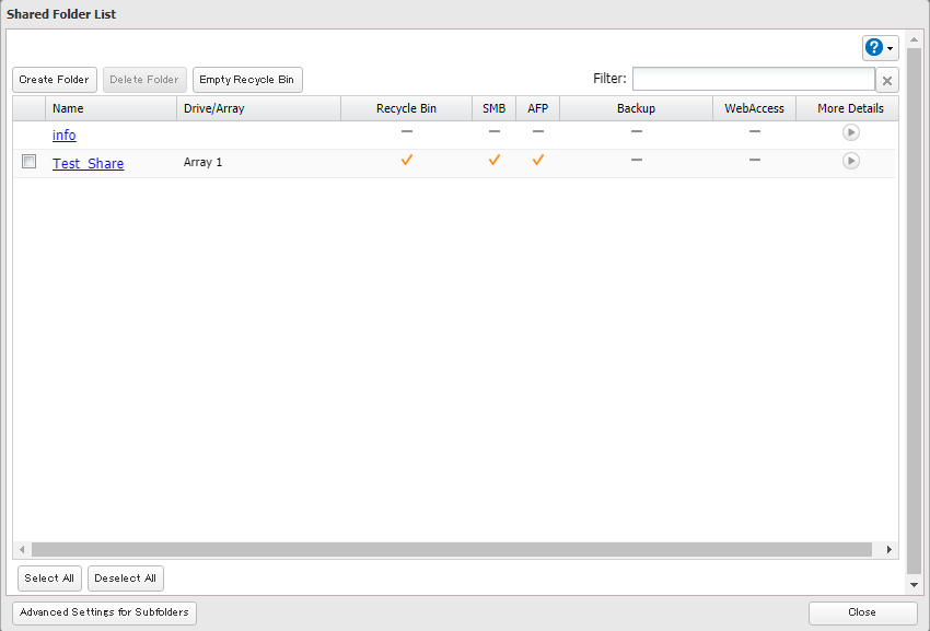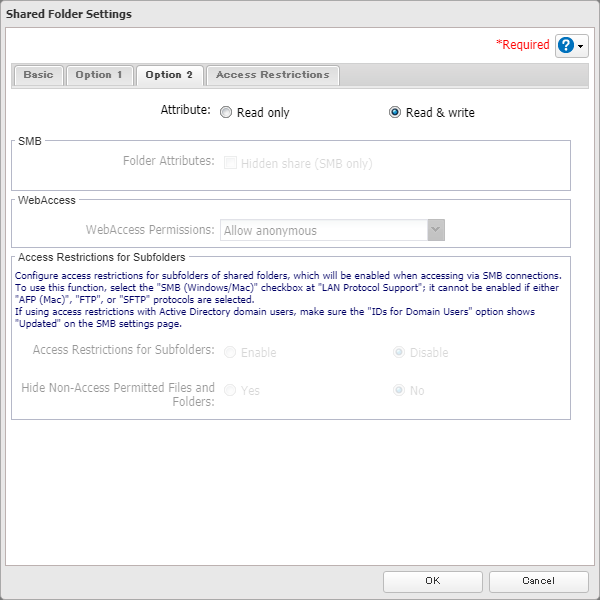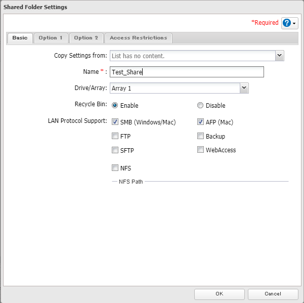 For TS1000/3000/5000/7000 series, please refer to this KB. 1. Log in to the management GUI for the TeraStation. You can access the GUI by either entering the TeraStation's IP address into a web browser or by using NAS Navigator. 2. Navigate to the "File Sharing" tab and click the Folder Setup widget button. 3. Click Create Folder. 4. Enter a folder name. The folder name may contain up to 27 alphanumeric characters, hyphens (-), and underscores (_). Do not use spaces in the name or a symbol as the first character. The sample screenshot displays default settings for Recycle Bin, and LAN Protocol Support. Additional supported protocols can be added now or at a later time. NOTE: By default the SMB and AFP protocols are enabled on new folders. SMB shares are typically used by Windows clients while AFP shares are typically used by Mac OS clients. The rest of the protocols available in the list relate to internal TeraStation functions except for NFS. NFS shares are typically used by Linux/Unix based clients. 5. When you click the Option 1 tab, you can enter the folder description. Descriptions may contain up to 75 alphanumeric characters, hyphens (-), underscores (_), and spaces. Multibyte characters are supported. The first character should not be a space. 6. Option2 tab • Read-Only Shares: By default, new shares are set with read and write access, but you may change the folder attribute here. • Hidden Shares: If a shared folder becomes hidden, it will not be displayed under Network, and only certain users will be allowed to access it. If protocols other than “SMB (Windows/Mac)” or “Backup” under “LAN Protocol Support” on the Basic tab are enabled, the hidden shares option will be grayed out and cannot be selected. • Access Restrictions for Subfolders: You may restrict access to subfolders in shared folders by configuring access permissions from your computer using Windows File Explorer. Please follow this article. 7. You may restrict access for specific shared folders, including external USB drives. 8. Once all fields are set, click OK. The newly-created folder should now be included in the shared folder list. Click Close to finish.