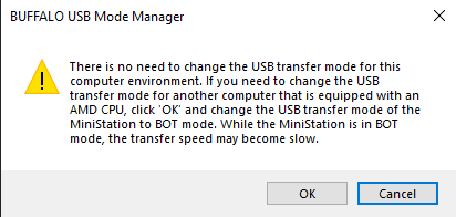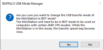Notes: • On a computer with one of the target AMD CPUs, the USB transfer mode cannot be changed to auto mode. • It is recommended to backup any data on the MiniStation before changing the USB transfer mode. • If you change the USB transfer mode to BOT mode, the transfer speed may become slow. • If you have any questions, please contact Buffalo technical support.