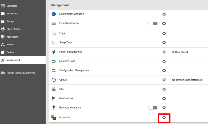 1. From a migration destination NAS device WEBUI, navigate to the Management tab. Then click the “Migration” settings icon to the right.