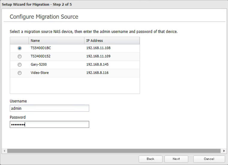 4. Select a migration source NAS device from the detected device list, enter the admin username and password for the selected NAS, then click Next.