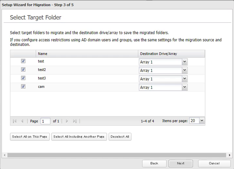 5. All shared folders on the source NAS device will appear on the list. Select folders to migrate and select their location on the destination NAS Drive/Array, then click Next.