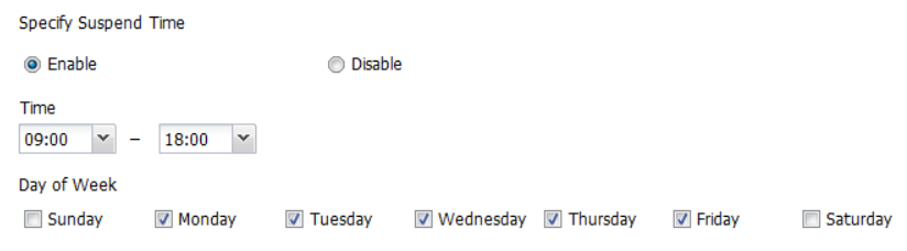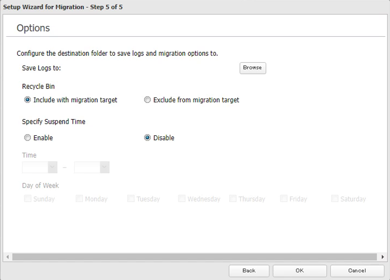 If you enable “Specify Suspend Time” from the migration options, you can have the migration process automatically suspend at the specified day of the week and time, such as during business hours.