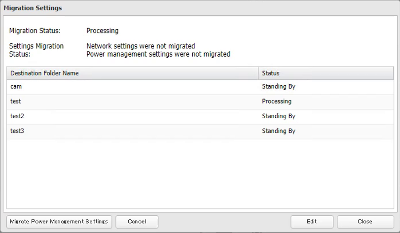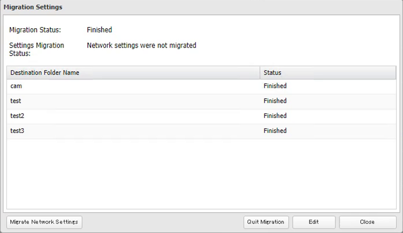 11. You will only be able to migrate network settings after all the data migration are finished. Click the “Migrate Network Settings” button. Note: If you migrate the network settings before migrating the power management settings, you will no longer be able to migrate the power management settings after that. Click Yes to start migrating. When the following message appears, disconnect the Ethernet cable from the migration source NAS and click OK. After complete, the network settings will be migrated to the target NAS. Use the migrated IP address to access the target NAS. Migration complete.