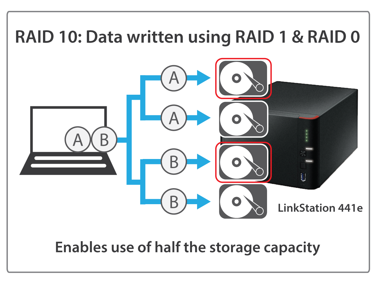 When two or more hard drives are inserted, LinkStation 441e supports RAID 0/1/5/10 for maximum capacity or redundant data protection.ted, LinkStation 441e supports RAID 0/1/5/10 for maximum capacity or redundant data protection.