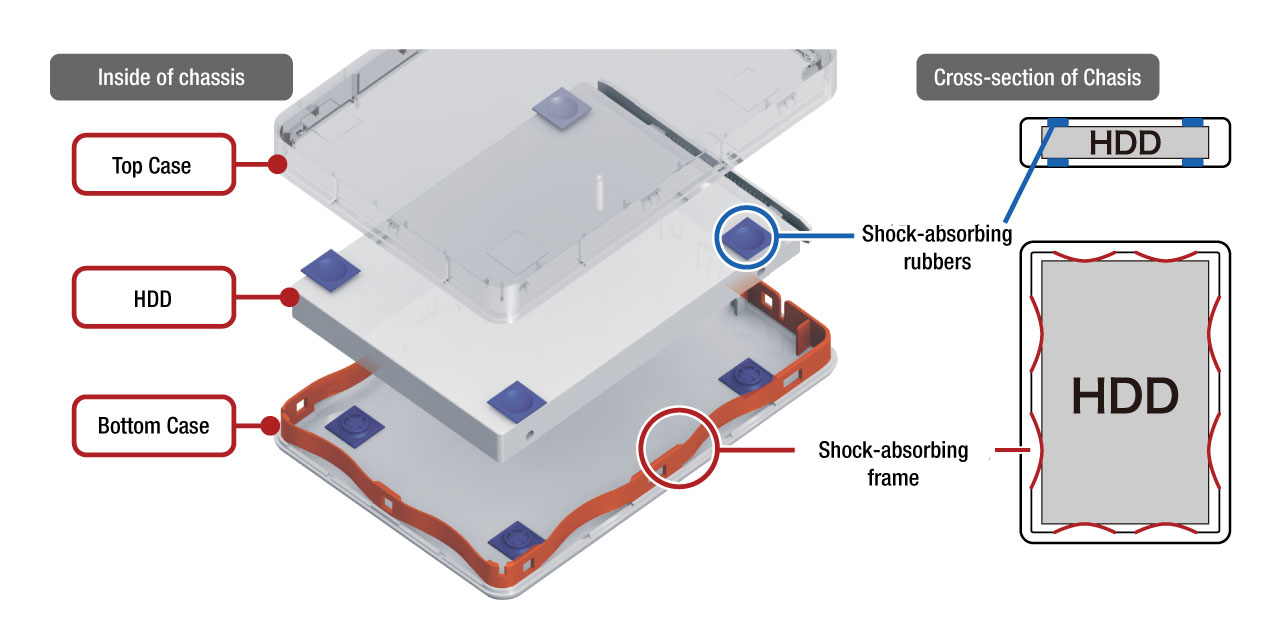 Accidents happen, especially when you are on the go. This drive chassis includes a special leaf-spring frame and a total of 8 (2 x 4 square) shock-absorbing rubbers to firmly protect the built-in drive. This product is shock-resistant from 2.5 ft (75 cm), or average desk height.