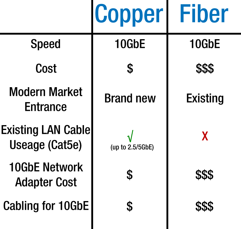 We know businesses and institutions will continue to integrate 10GbE into their networks and copper the cost effective way to attain this networking. Below is a chart showing why Buffalo implements the copper method in its 10GbE devices over the traditional fiber.