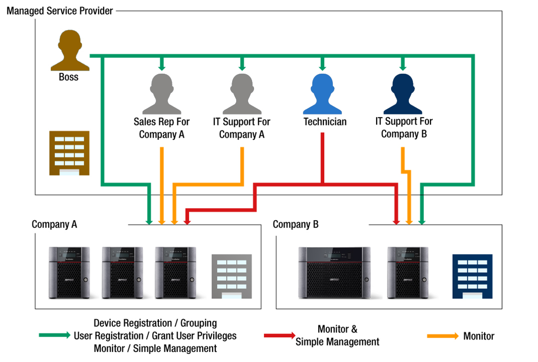 NAS management often require multiple users to access it. Remote Management Service enables multiple users to access and manage a Buffalo NAS device, and provides hierarchical user roles with different privileges so you can assign multiple users to the same device based on logistical needs.