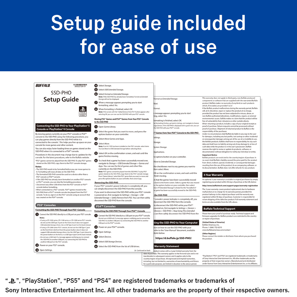 The Buffalo SSD-PHO is a officially-licensed external SSD (Solid State Drive) for PlayStation®. This external SSD uses specially-selected materials and has passed our exclusive quality inspection to work with PlayStation®.