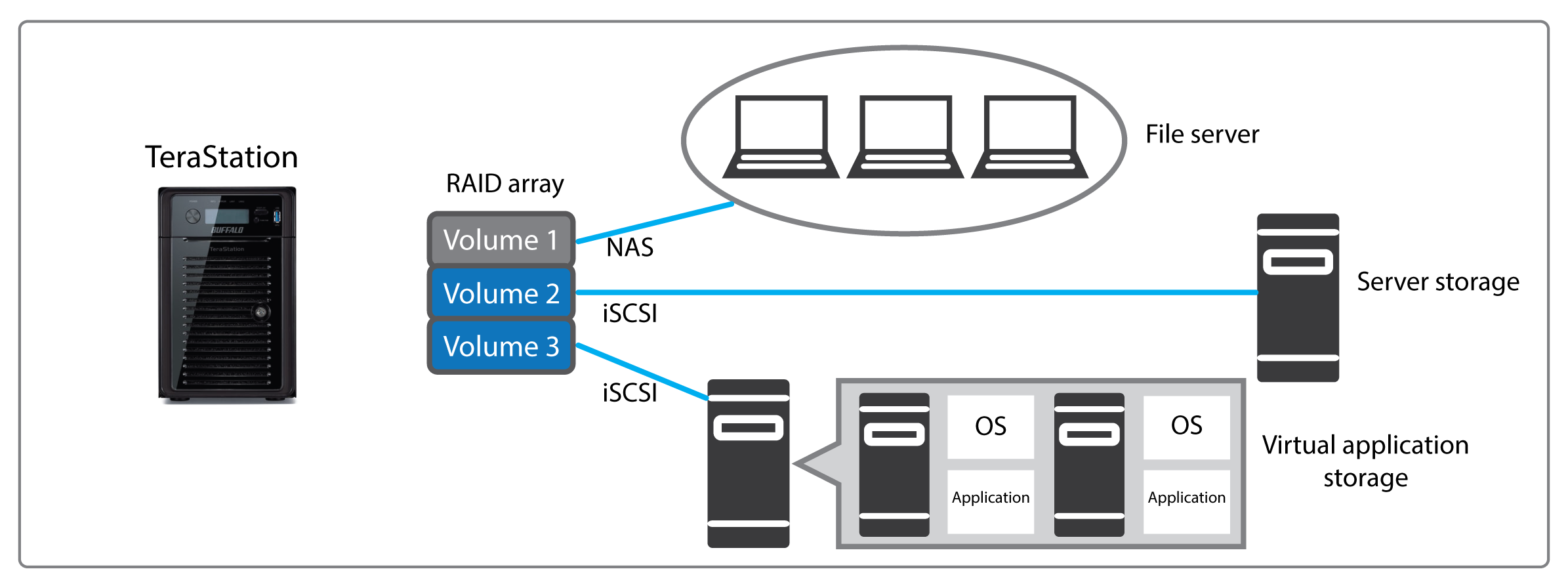 Configure TeraStation WSH5610DN as an iSCSI target to add affordable virtualized storage to your business network. Storage virtualization serves to decrease IT spending by maximizing the resources offered by modern servers while providing affordable server scalability and reliability. A virtualized environment removes a significant amount of server dependence, shifting the burden to the storage devices.
