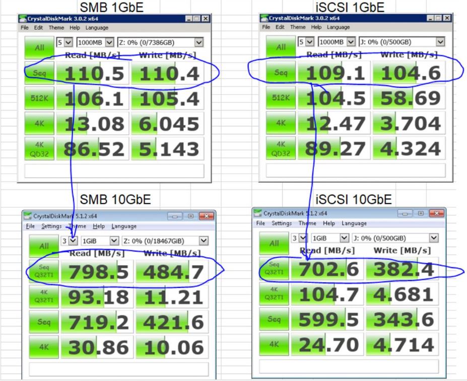 For 10GbE, we see sequential reads and writes (medium to large file copies) jump from 110 MB/Sec to nearly 8x that for reads and 3-4x that for writes. Random 4k access is considerably slower as expected, but still respectable. This is real world stuff, not massively theoretical numbers like “2.19x10^6 IOPS!!!1!” Which are achieved with the most expensive drives built for boutique applications and the lowest possible operation size. If you are going to spend that kind of money, I recommend buying an actual server, not an SMB oriented storage appliance.