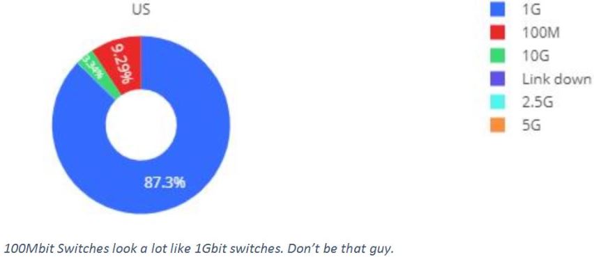 In terms of throughput in Megabytes per second, all our current generation business class NAS units can easily saturate the slowest link in the data chain, the thing that makes a NAS a NAS, that being the network. At 100% link saturation, a 1GbE link will max out around 110 MB/Sec provided there is zero other traffic on the network, which is unlikely. That’s not the worst part of this though. Recent usage data from systems in the field show that a significant number of users are still on 100 MEGAbit networks, which have been obsolete for nearly 20 years, and certainly haven’t been mainstream for at least 10.