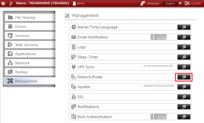 1. Logon to the TeraStation WEBUI that you want to transfer configurations from. From the Management tab, click on the setting widget of the Restore/Erase.