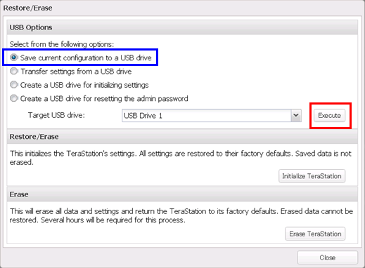 Procedure for TeraStation Other Than TS-X Series Models Refer to the user manual of the TeraStation that you want to transfer settings for saving settings to a USB drive. We will use TS5000 series for example.