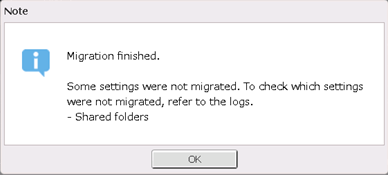 Notes: • If the migration target Buffalo NAS device contains shared folders, users, and groups that share the same name as the transferred settings, the existing settings on the migration target will be overwritten by the transferred settings. • If the migration target Buffalo NAS devices have already added some shared folders, users, and groups, the transferred settings may exceed the maximum number of allowed shared folders, users, or groups. Excess items will not be transferred. After migration finishes, open Settings and verify that all settings were properly transferred.