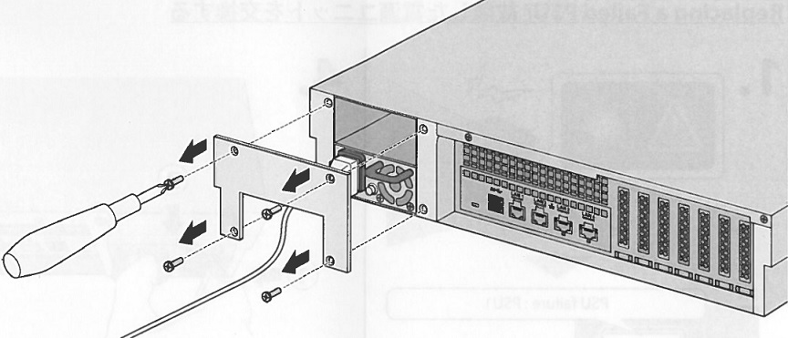 4. Release the locking tab, at the same time grasp the handle and slide the failed power supply straight out of the chassis.
