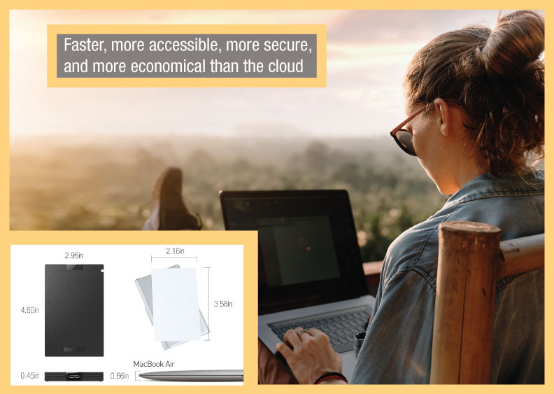 Whether it’s work or play, the BUFFALO SSD-PG with its blazing fast write speed makes for perfect external storage. You can quickly copy a larger file to the SSD instead of uploading it to the cloud at the mercy of your Internet connection, and if you’re in professional need of fast and secure storage, the BUFFALO SSD-PG is ready as a compact device for on-the-go backup for photos, videos, documents, and more.