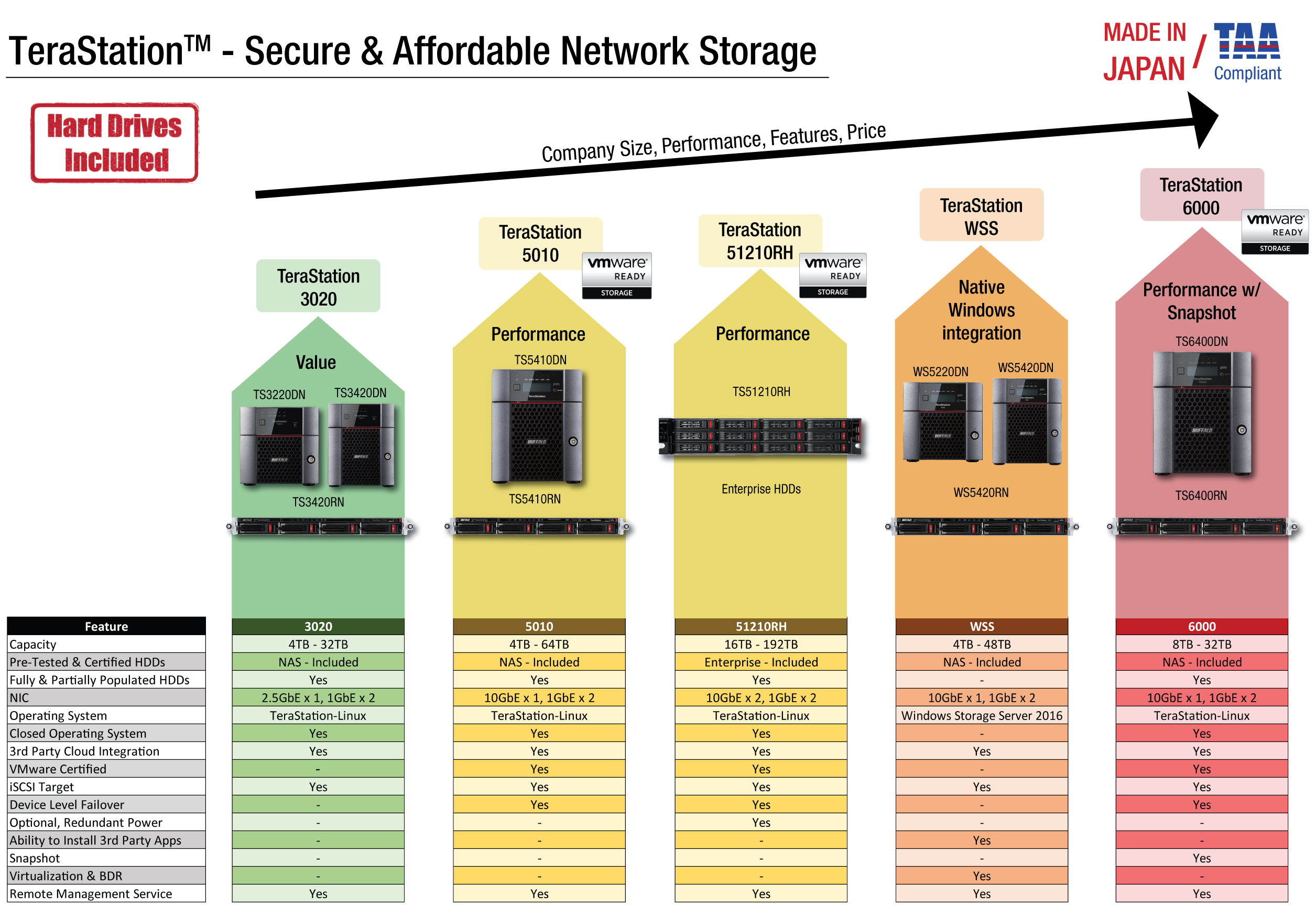 All TeraStation 3020 systems include pre-tested NAS-grade hard drives and pre-configured RAID for efficient setup. TeraStations’ closed operating system ensures maximum data security, and the full system is backed by Buffalo’s award winning North American based Technical Support.